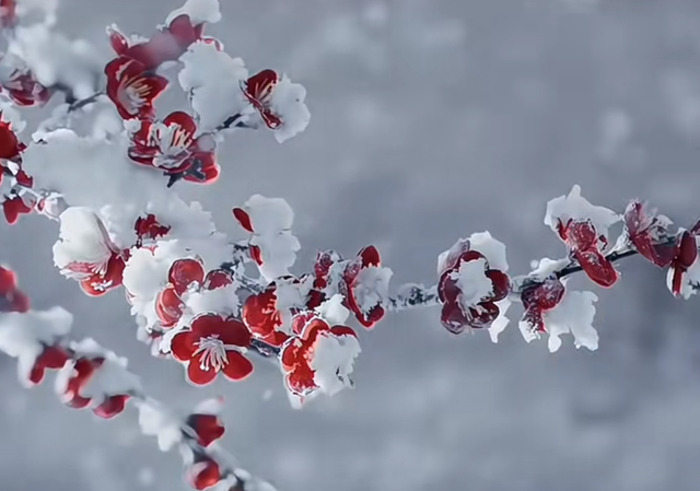 寒风凛冽,万物仿佛都被冰封在时间的静止中。然而,在这一片洁白的世界里,梅花却倔强地伸展出它坚韧的身姿。那覆盖其上的白雪,如同为它披上的一层晶莹纱衣,红色与白色的花瓣交织成画,每一片都透着细腻的纹理,它们并不惧怕严冬的侵袭,反而迎着刺骨的寒风舒展自己,散发出淡雅却沁人心脾的幽香