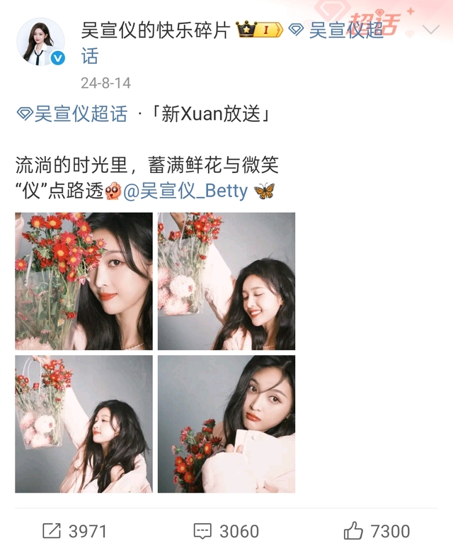 然后下午五点多的时候,吴宣仪的快乐碎片发了条微博