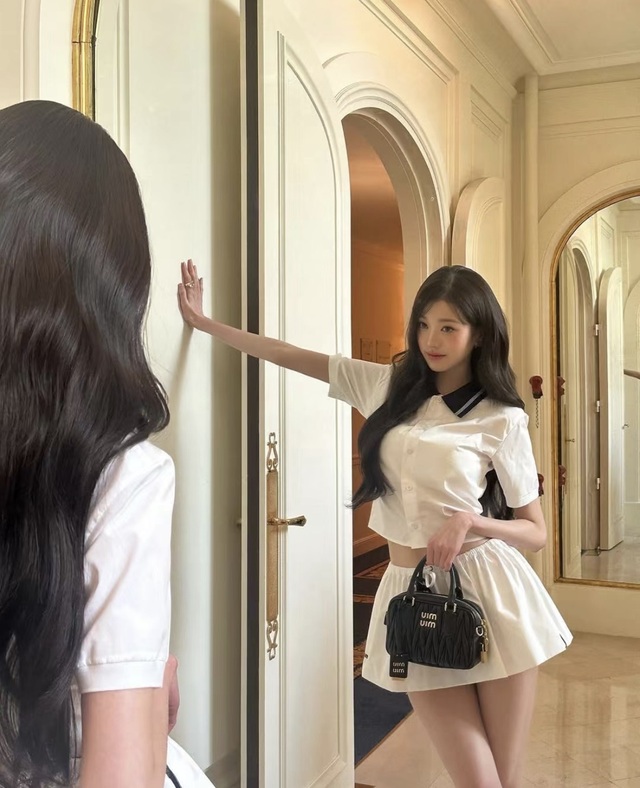 余小晚她站在房间中央,宛如一颗璀璨的星辰降临凡尘。白色的上衣柔软贴身,勾勒出她优雅而纤细的轮廓,短裙随着她的动作轻轻摆动,仿佛春日微风拂过花瓣般灵动。手中的小巧手提包为这份简约增添了一抹精致,每一个细节都透露着不凡的品味。 灯光如流水般倾泻而下,洒在她的长发上,那栗棕色柔顺的秀发闪烁着丝绸般的光泽,每一缕丝线都像是被精心雕琢的艺术品,她凝视着镜中的自己,目光中带着一丝审视,又夹杂着几分满意。或许是在确认自己的完美无瑕,又或许是在寻找某种内心深处的答案。 镜子将整个空间无限延展,映照出更多的精致