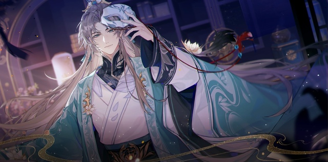 那人微微一顿,上前一步,站在了烛光之下。他一袭青衣,长身而立,烛光在脸上留下一层暖色,也映出他遮掩容貌的狐纹面具。