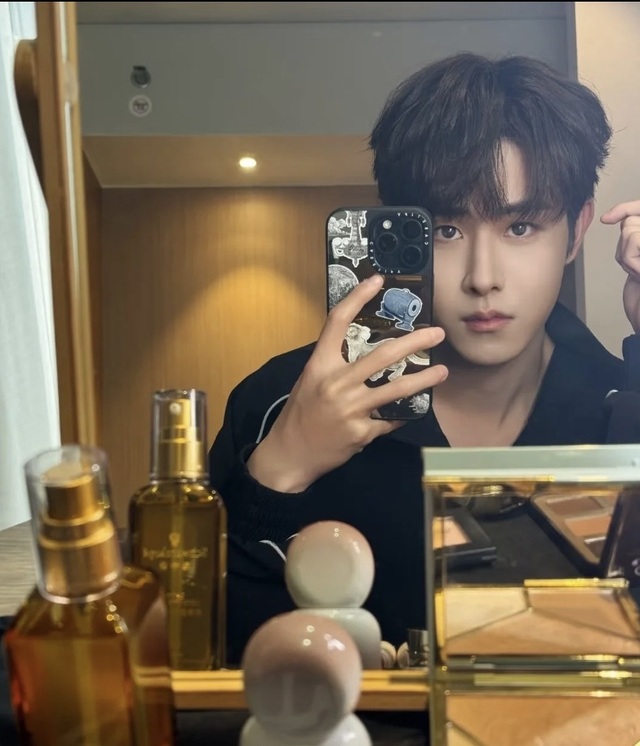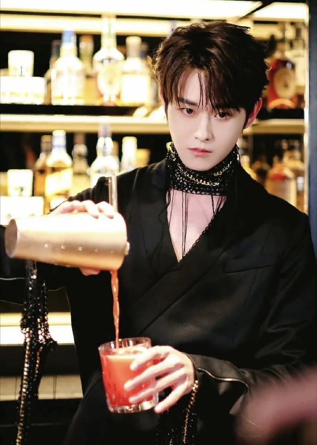 照片里他已经做好了妆发,穿着品牌提供的时装,调着手里的酒,和早上那个赖床的大男孩判若两人。
