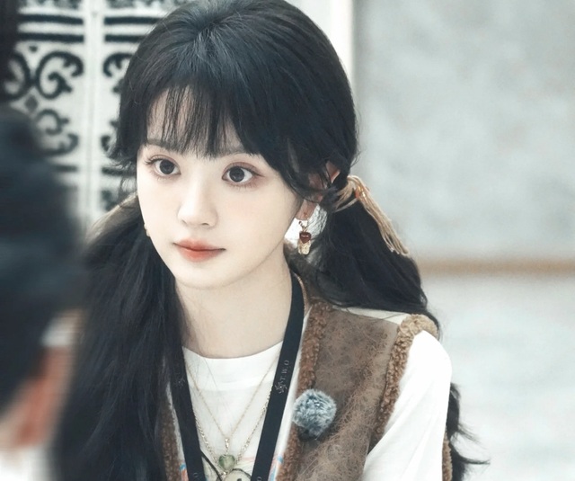 她穿着卡其色马甲白色体恤,乌黑的卷发用皮筋扎了两个低马尾,耳后方两缕碎发翘起来,微风轻拂,鬓间几缕碎发晃动,撩着她白皙通透的耳垂。