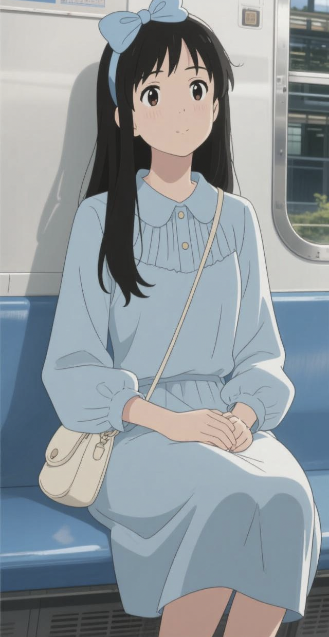 苏子睿穿着一条浅蓝色的连衣裙腰部有收腰处理,勾勒出纤细腰身,凸显身材曲线。裙摆宽松且呈大摆型,长度至小腿附近,行走间自然垂坠、摇曳生姿,富有动感,整体材质轻盈飘逸,似能随风舞动,尽显浪漫随性,又用蓝色发箍固定住了头发从地铁站里走出一阵风吹来她的裙子和头发都在随风舞动。
