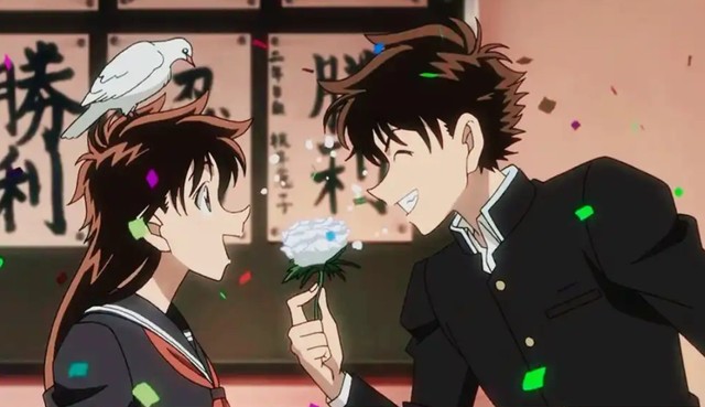 快斗背着书包从考场里走出来,左顾右盼的寻找青子的身影。却不知青子悄悄溜到了快斗的身后,她用手摆出一个手枪的姿势,对准快斗: