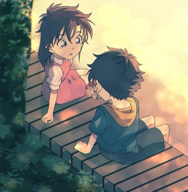 梧桐树林中,青子坐在一块大石头上,快斗和她紧挨着