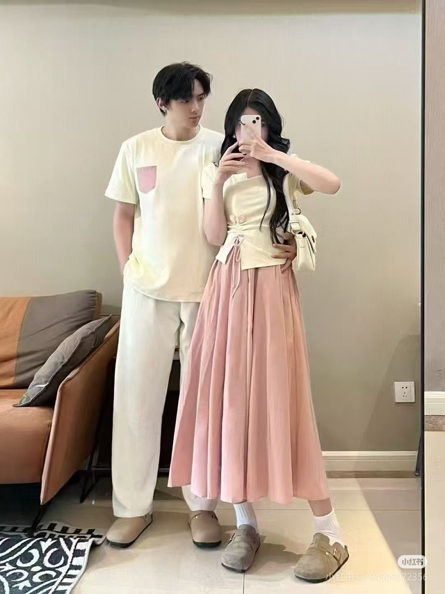 郭麒麟身着一件米色短袖,衣襟上巧妙地缀着一个粉色口袋,既简约又别致。下身搭配白色工作裤与干净利落的白色帆布鞋,整体造型透着一股随性却不失细致的气息。而赵霄宁则以米色短袖上衣呼应,下半身着一袭粉色半截长裙,轻盈柔美,脚下一双白色的帆布鞋更为她增添了几分清新自然的感觉。二人这般低调的情侣装扮宛若风景画中的点缀,无需太多言语,举手投足间便已流露出温暖甜蜜的默契与爱意。