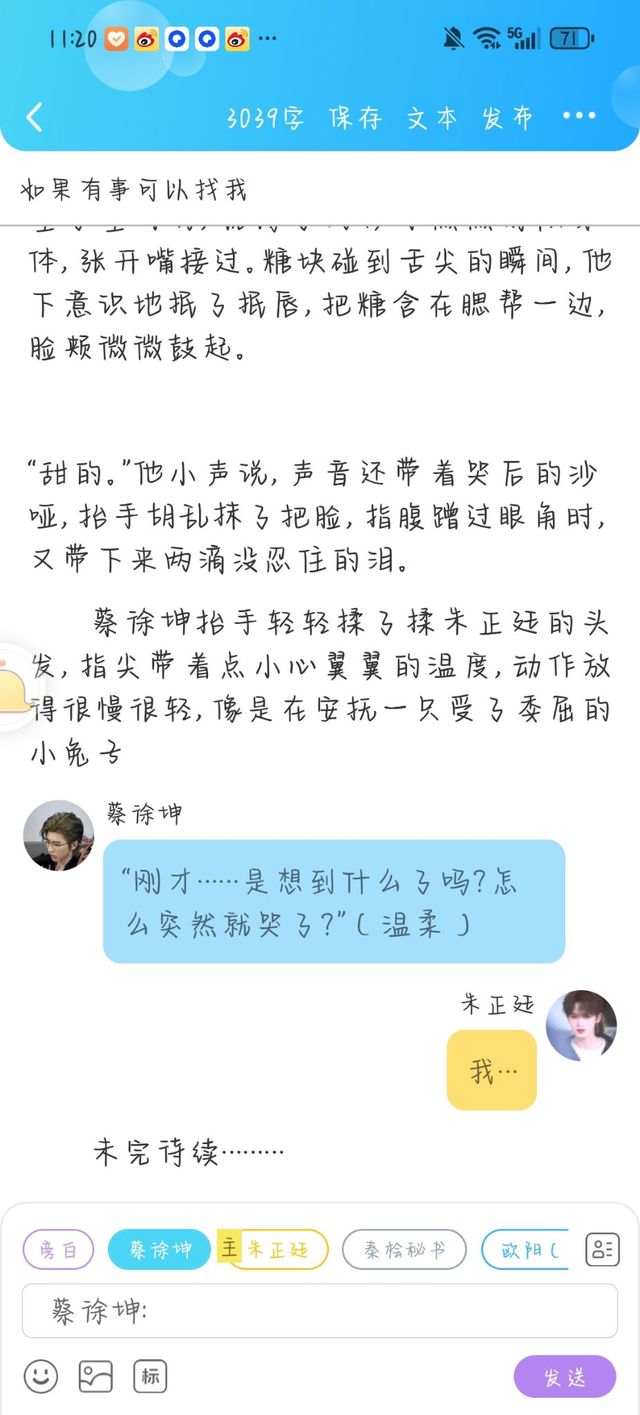 朱正廷蔡…蔡总,你好好呀,其实我从不敢和别人说因为我觉得自己在这个世界上好像总是不被人在意不被爱,除了奶奶,很少有人会关心我过得怎么样。今天能听到你这么说,我真的好开心,终于知道到被安慰是什么感觉了