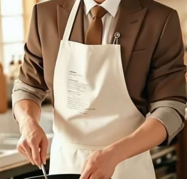 厨房里熙泰穿着修身的棕色西装,胸前却挂着卡其色围裙,两只袖子高高挽起露出结实的手臂。