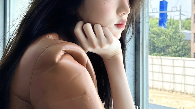 女孩的头发有部分被雨水打湿,湿漉漉的发丝就这样微微黏在她的脸颊上。