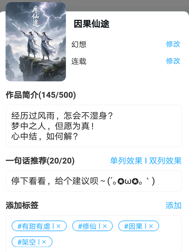 深渊寻光"小二,来一盘花生,一壶茶。"陈渊招呼小二道 陈渊,柳叶眉,丹红唇,面如春风,肤色洁白无瑕,如玉一般,身着一袭白袍,上绣几枝青竹 "诶,好嘞,客官,您稍等。"小二点头哈腰道 "诶,这位兄弟,去哪儿啊?我这一路上总见着你!"陈渊后面,一位名叫叶凌辉的人拍了拍陈渊的肩膀,笑眯眯的说到 叶凌辉,肤如白雪,身如利剑,眉如柳叶,眼似竹叶,唇如鲜血 眉眼如画,身姿如燕,用于形容其二人不足为过 "啊!我嘛,就是求道,修仙!"陈渊动作一顿,随后装作无事发生,转头笑道"你呢?" "我?我也是,想着求道,修仙!"叶凌辉笑道"相逢便是缘!不如咱们一起,修仙得道!" "好啊!"陈渊道 "小二!来一壶茶!一盘瓜子!"叶凌辉招呼小二道 "好嘞!客官!您稍等!"小二远远应到 "诶,兄弟!我是女子,你不介意吧?"叶凌辉对陈渊道 "当然啦!那你不介意我是灾星吧?"陈渊笑道 "当然当然!"叶凌辉拱手道"在下也是灾星。" "同是天涯沦落人!"陈渊把花生抛起来,用嘴接住 "更显得我们有缘了,真是有缘千里来相会!"叶凌辉自斟了一杯茶,喝了一口 "哈哈哈哈!"叶凌辉和陈渊相视一笑 "咱们确是有缘啊!"陈渊笑道 "对对对!"叶凌辉拱手"不如我二人就此结拜吧!" 陈渊也拱手道:"好!我二人就此结拜!" 叶凌辉道:"可这辈分难论啊!在下的年纪是个迷,年幼丧双亲!" 陈渊叹道:"我亦是如此!" 叶凌辉道:"我二人果真有缘!不如不论辈分!只唤兄弟!如何?" 陈渊道:"您真是好粗明!那就叫我!陈兄弟罢!" 叶凌辉道:"好!那就叫我!叶兄弟!" 陈渊再拱手:"叶兄弟!" 叶凌辉拱手:"陈兄弟!" "哈哈哈哈哈!"二人再次大笑 陈渊悄悄从腰间香囊取一些粉末,用灵力包裹住,藏在手中 叶凌辉默默将腰间小刀藏入袍服之中 "我二人果真有缘!"陈渊再道 "是呐!"叶凌辉拱手 ———————————————————————————— "叶兄弟,你家在何处啊?"陈渊手中把玩着短刀,似是不经意间一问。 叶凌辉的脚步微微一顿,随后面色如常的笑道:"我也忘了自己家在何处,年幼丧双亲。四海为家,走到哪里,哪里就是我的家。" 陈渊嬉笑道:"诶呦~咱们怎么这么有缘啊!这可真是有缘千里来相会!"说着,陈渊搂过叶凌辉的肩膀,一副好哥俩的模样 叶凌辉身子僵了一下,轻轻的将陈渊的手移开,缓慢道:"男女授受不亲。" 陈渊笑道:"哎呀呀~好兄弟还讲就这个?" "那倒也是!是我思想有些固化了!"叶凌辉笑着说到,边说边将小刀藏于手中 "嘿嘿嘿!哪是?"陈渊嬉笑着说"不是你的思想固化,而是兄弟我的思想太过先进了!" "哦~"叶凌辉指着陈渊"你小子套路我?" "怎么能这样说你兄弟我呢?"陈渊夹着嗓子道 "咦~"叶凌辉装作嫌弃的朝着陈渊扇扇手 "呼~"忽然,林子里传来一阵风声,很不对劲 "小心。"叶凌辉小声道 "嗯……"陈渊点点头 果不其然,一双眼睛从树丛间出现,缓慢移动 双方对峙着 "吼!!!"林子里的凶兽率先出手,冲向戒备的二人 凶兽目似铜铃,一张血盆大口甚是吓人!一身黑毛,爪子锋利,在月光下闪闪发亮 "噌!"叶凌辉抽出剑,向凶兽冲去 凶兽扬起爪子,向叶凌辉挥去 叶凌辉悄悄将即将要刺到凶兽要害的剑一撇,刺空了 凶兽吼叫,是生气了,落下的爪子更重,叶凌辉接着力,向后撞去 "噗!"叶凌辉咬开藏在口中的血袋"这凶兽果真厉害!兄弟!待我降住它!" "兄弟!不必如此!待我去降住这凶兽!"陈渊抽出宝剑,直向凶兽冲去 二者斗的难舍难分,陈渊一直是刺中凶兽的要害差一点点,似是故意为之,叶凌辉趁机一剑刺到凶兽要害,凶兽一声嚎叫,再也起不来 "咳咳!"陈渊拿剑支撑住身子"咱们这算是过命的交情了吧?" "是已!"叶凌辉道 "哈哈!咳!"陈渊一笑"结伴同行,但愿不是一个笑话……" "咳咳!但愿吧!"叶凌辉回以一笑 ——————————————————————————— 有小细节哦,有人能看出来吗?⊙▽⊙ 再次强调!简介很重要哦!(。・ω・。)ノ♡ 本次细节所指:经历过风雨,怎会不湿身? (/≧▽≦/)