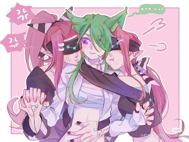 绿发女子宛如灵动的精灵,短而尖锐的耳朵彰显着她的独特,紫色的眼睛仿若蕴含着无尽的神秘星河,条纹装饰的衣服勾勒出她曼妙的身姿。她欣然接受着红发男子的目光,两人面带微笑地看着对方的手指。那些特殊的符号或者装置仿佛是他们之间独特的情感纽带,每一个符号都在诉说着他们之间隐秘而美好的情愫。在这温馨和谐的氛围里,他们的爱就像一首神秘的乐章,在彼此的心间缓缓奏响。
