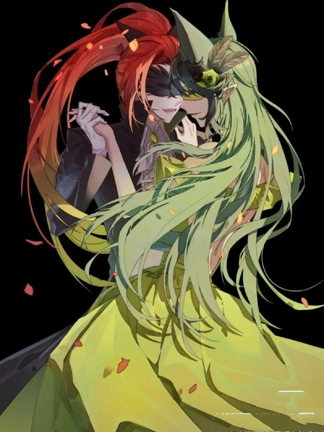 黑色的背景让他们的身影更加鲜明,仿佛整个世界都消失了,只剩下这对相遇的灵魂。在暗色调的衬托下,那一抹红色与绿色显得格外动人,像是在诉说着一个关于羁绊与救赎的故事。