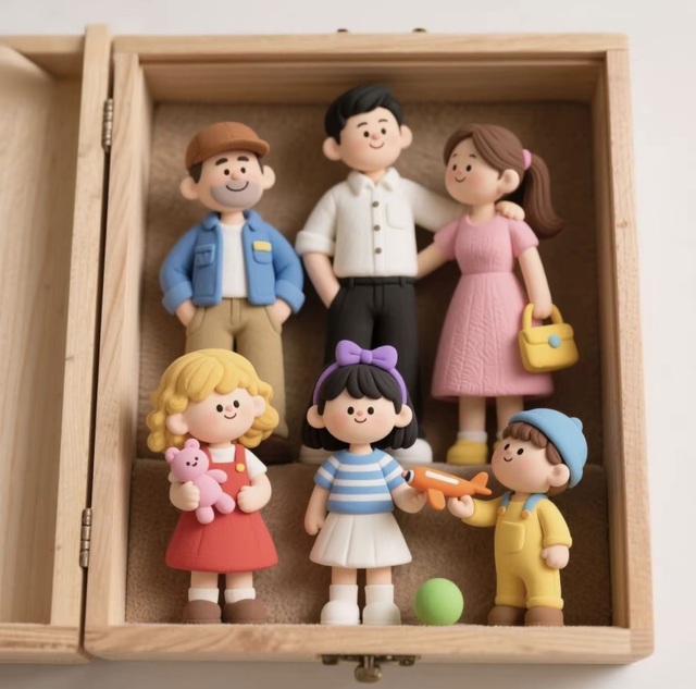 池影昔这是我自己在我爸妈还没有出车祸之前我还是一个很幸福的小孩的时候捏的抱在一起的就是我的爸爸妈妈,中间带着紫色发箍的是我旁边就是我舅舅的女儿和儿子