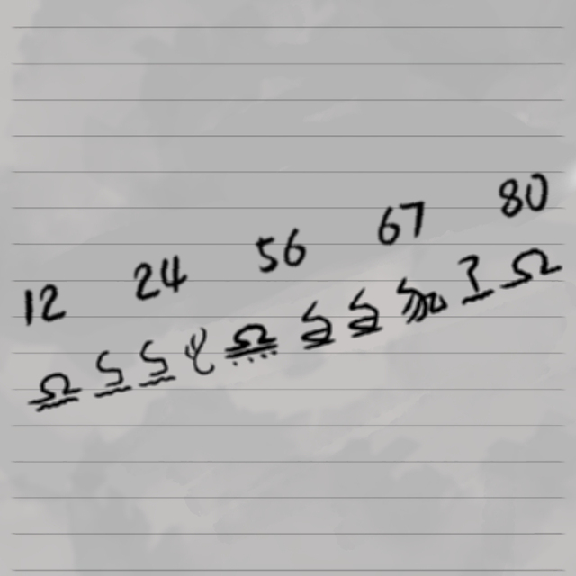 随便翻了几页,发现在12几页左上角写有熟悉的符号,见此,简子栖开始逐步翻页,最后得出有写符号的页数分别是12、24、56、67、80。它们各自对应着一个或两个符号。