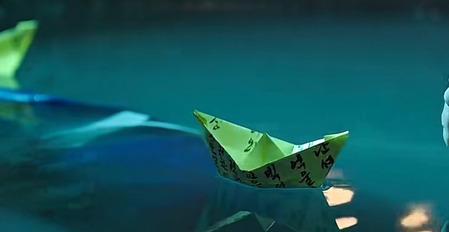 小白看向水中的纸船。