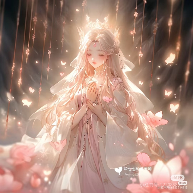 在那如梦似幻的世界里,有一位女子,仿若从画卷中走出的仙子。她拥有一头长长的白发,如月光倾泻而下,精致的脸庞宛如上天最完美的雕琢。头顶的皇冠繁复而华美,其上花朵形状的小饰品,恰似灵动的精灵栖息于其上,为这皇冠注入了一抹柔美的生机。她身着粉色长袍,如同被晚霞温柔地包裹。那长袍随风摇曳,衣摆似轻云般舒展飘荡。胸前的几条细链子静静垂落,相互交织碰撞间,发出清脆声响,犹如奏响一曲奇妙乐章,让整体更添独特韵味与层次之美。周围的背景亦是奇幻无比。金色丝带在空中肆意飘舞,粉红的蝴蝶围绕身旁翩翩起舞。这场景,恰似魔法在空间中流淌蔓延,每一处角落都充满了神秘诗意,仿佛只要踏入,便能忘却一切凡尘俗世,沉醉在这神奇的魔法天地,不愿醒来。这是镜歆甜。