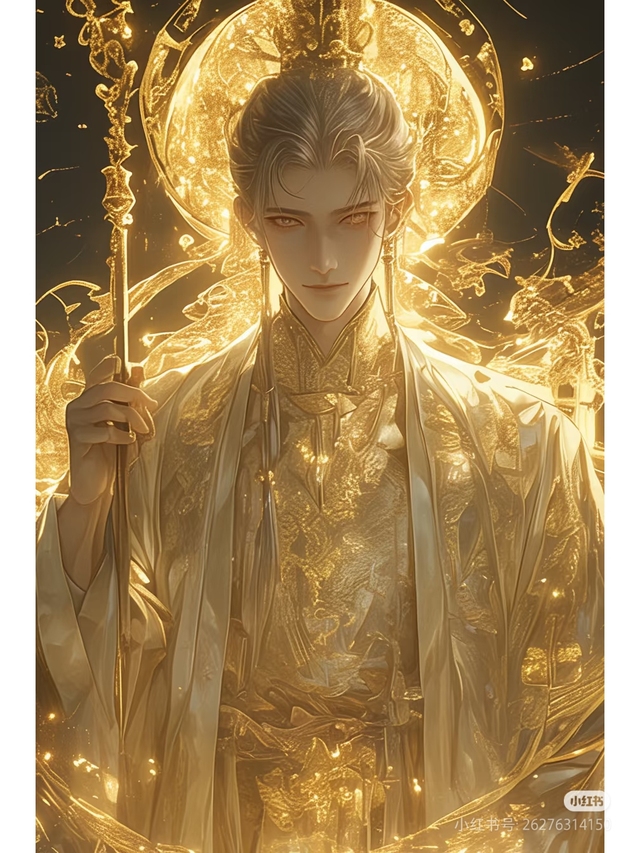 他站在那里,如同天穹下降临人间的神祇,周身笼罩在一片柔和而耀眼的光辉中。华丽的金色长袍垂落至地面,仿佛是晨曦织就的锦缎,每一寸都闪烁着不可逼视的璀璨光芒。那长袍上的纹路精致繁复,犹如星辰运转、江河奔流,又似某种神秘莫测的符文,诉说着古老而崇高的力量。他手中的权杖更是令人屏息,其上镶嵌着一颗通透晶莹的宝石,宛如凝聚了天地间最纯净的灵韵。权杖微微斜指地面,却散发出一种难以言喻的威严与震慑力,让人不禁心生敬畏。他的姿态从容而优雅,没有半分骄矜或傲慢,却自有一股让人无法忽视的气场,就像一座屹立千年的圣山,沉稳而不可撼动。乌黑浓密的头发被梳理得一丝不苟,高高的发髻用一支雕琢细腻的玉簪固定,更添几分庄重与肃穆。他的面容如刀刻般分明,线条刚毅却并不冷酷,反而透出一种悲悯众生的慈悲感。那深邃的眼睛如同夜空中的星海,既有洞察万物的智慧,也有包容万物的宽厚。他目光坚定地望向前方,仿佛能穿透时间与空间,直抵未来的尽头。而他背后那巨大的光环,则为他平添了一抹超凡脱俗的神秘色彩。光环缓缓流转,金光与白光交替映射,宛若宇宙初开时的第一道曙光。它不仅衬托出男子的神圣,还将他与这个世界分隔开来,让他看起来既近在咫尺,又遥不可及。这是一位超越凡俗的存在,无论是他华贵的装束、坚定的神情,还是身上散发出的那种凛然不可侵犯的气息,都在无声宣告着他的身份——光族王储。这是盛吟光。