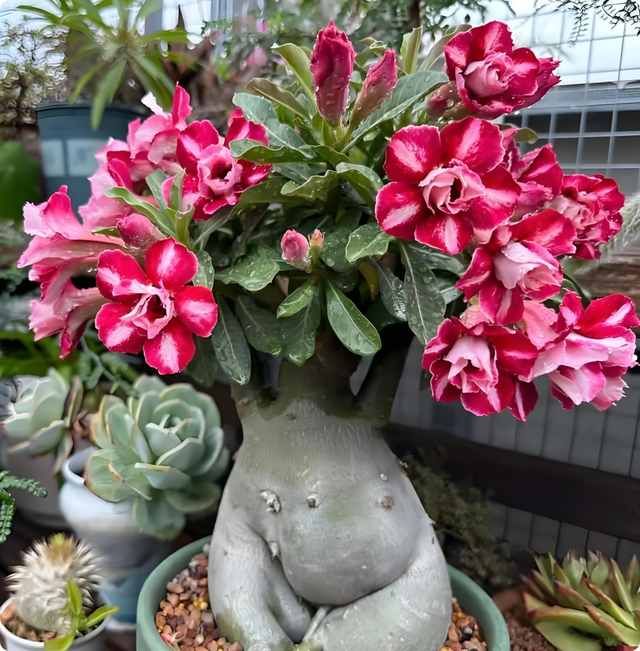 沙漠玫瑰:夹竹桃科天宝花属多肉植物,原产于非洲、阿拉伯半岛的热带沙漠等地。通过肥厚多汁的肉质茎储藏水分,花朵形状酷似玫瑰,颜色有红色、粉色、白色等