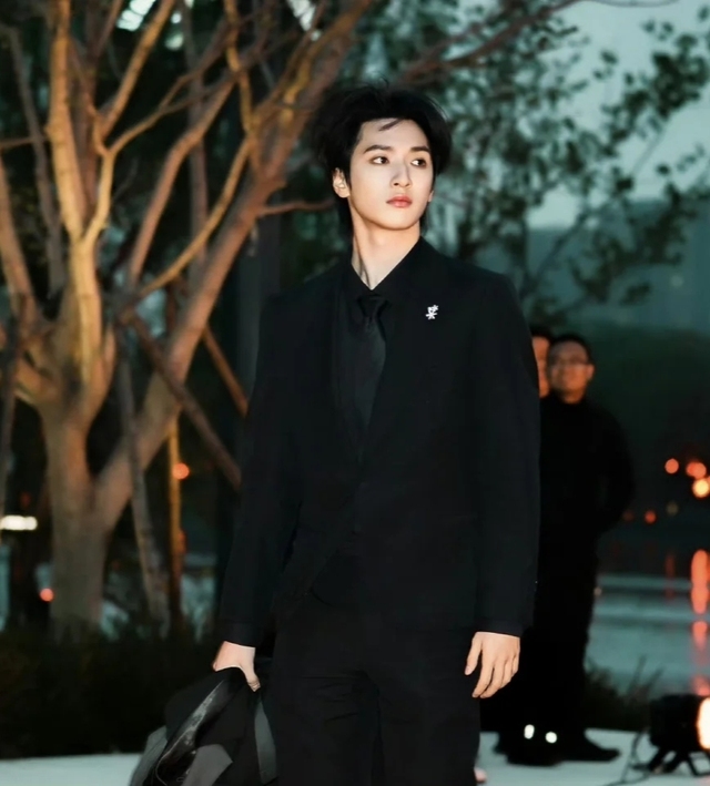 严浩翔穿着黑色系西装手里拿着外套,虽然头发被风吹乱了但却依旧帅气