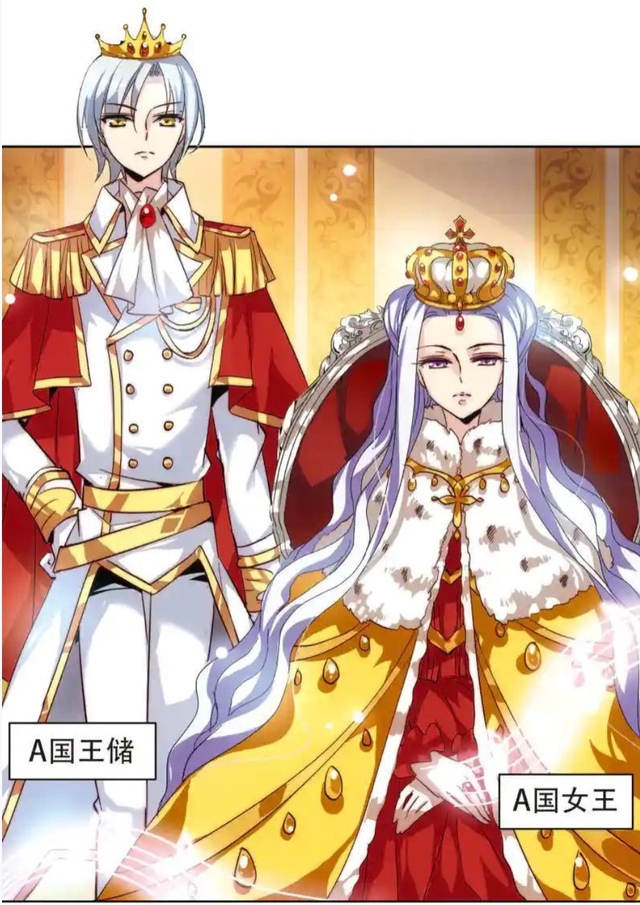 华丽的王宫会客厅里,水晶吊灯散发着柔和光晕,王储身着笔挺的白色宫廷军装,红色肩章与金色装饰相得益彰,王冠端正地戴在银发之上,步伐沉稳地走向端坐在王座的A国女王。
