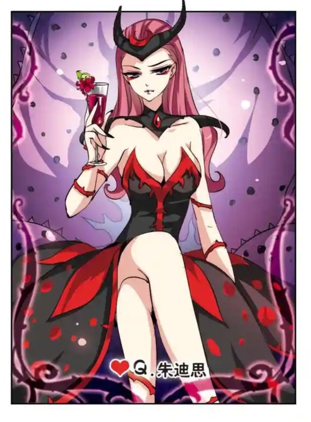 暗紫色调的神秘空间里,巨大的黑色花型王座上,朱迪思优雅托着酒杯,酒液如流动的暗红宝石。