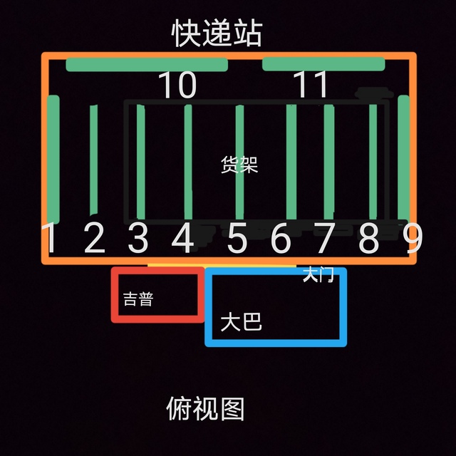 吉普车的后备箱对大巴车的车头,车门对快递站大门