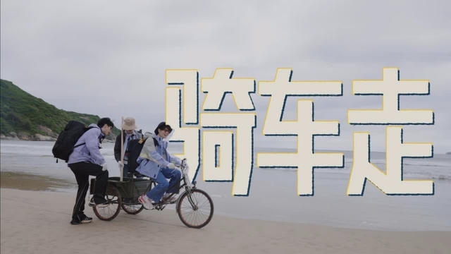 张真源骑车,严浩翔和宋亚轩坐在上面,温絮边走边看他们
