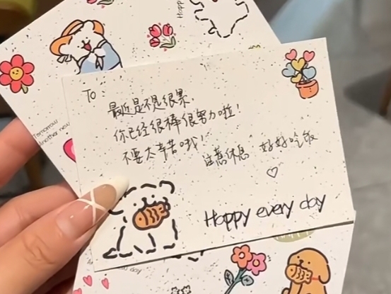 每个人的座位上都有一张卡片,卡片上写着不同的鼓励话语,都是手写,跟卡片在一起的还有张安冉的照片,还有鲜花模样的应援棒