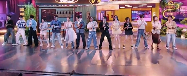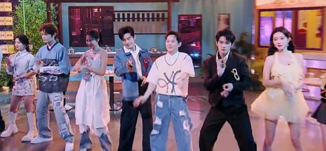 然后黄晓明登场和檀健次斗舞,但是音乐一变所有人排成一排