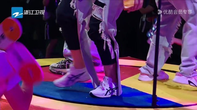 蔡徐坤也在蹦,努力套裤子: