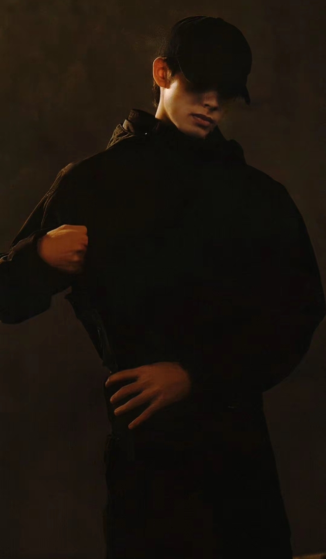 那人身着全黑服饰,头戴黑色帽子,在暗调背景烘托下,显得尤其神秘。