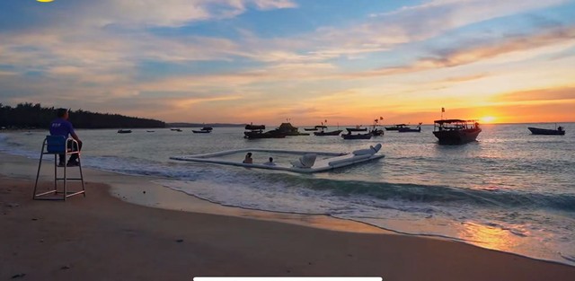 海面上的天空变得泛红 落日的余晖照在海面上也照在彭彭跟艺兴身上