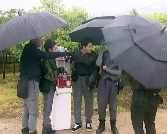 突然天空飘起了小雨,工作人员赶忙拿来几把伞。于是他们几位嘉宾两位合撑一把,向着目的地走去。