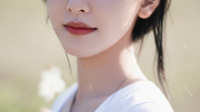 林妁穿着一件淡绿色的连衣裙,长发柔顺地披在肩上,面容清秀,眼神温和而沉静。她的腿上盖着一条薄薄的毯子