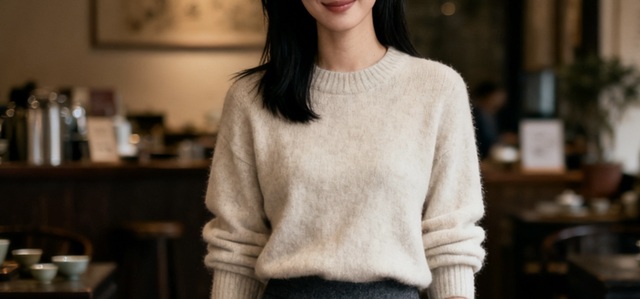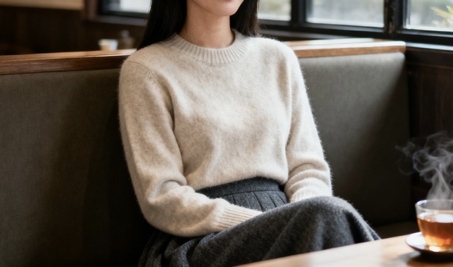 临窗的位置可以看到外面飘落的黄叶和匆匆的行人,穗礼出门前,特意换下了标志性的宽松舒适装束,选了一件质感稍好的燕麦色羊绒衫,搭配深灰色羊毛长裙——依旧是她偏好的柔和色系和得体剪裁,不过分突出曲线,但也显得温婉大方,她化了极淡的妆,遮掩了一下眼底的疲惫,左眼角下方的泪痣在清冷的光线下清晰可见