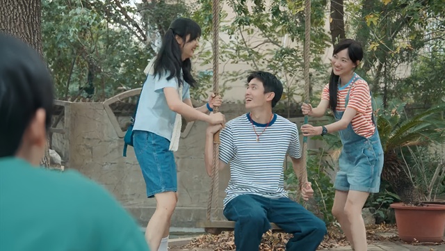 两个人一左一右站到了秋千旁,合力把秋千推高。