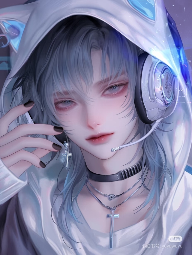 浅蓝色的头发顺着狼尾随意散落在身上,左眼下有一颗泪痣,脖子上还带着一个银色十字架项链!