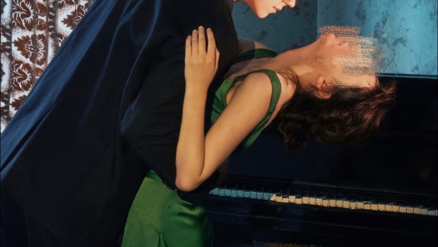 鹿晗的掌心稳稳托住她的后腰,另一只手撑在她耳畔,修长的指节微微陷入琴键,带出一串低沉的音符,在安静的房间里格外暧昧。