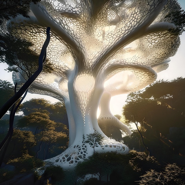 底部恰似树干,满布孔洞与镂空之态,通透而轻盈,白色与浅灰色交织于其上,表面如金属般光滑,在阳光下泛着冷冽又迷人的光泽,而上面众多分支如树枝般伸展开来,它们延续着镂空与网状的构造,渐次变细,直至化作叶的模样⋯⋯而夜晚,金黄色的灯光从镂空处点缀在其中,让这栋神秘建筑更添几分壮丽且让人难以移开视线⋯⋯!