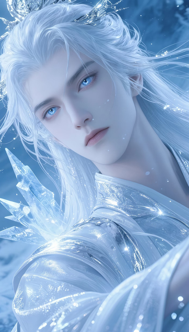 所有海浪凝聚一团缓慢形成人形,他湛蓝色的发色与海水相印,他秀美的面庞轮廓匀称流畅,皮肤如同白云般柔滑,宛如经过琢磨的玉石。肤色呈现出与揽蓝砖石般晶莹透亮,闪耀着珍珠般的光泽。