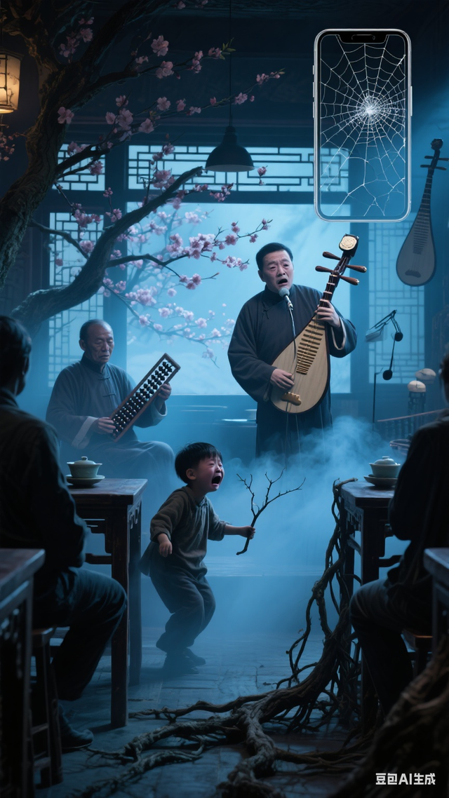 捧哏的从条凳后探身,青布短褂上别着片玄铁,反光刺得人眼跳:“哟!您说那十八层玉楼?一层穿堂里,鲁智深的禅杖正靠着路由器,铁环缠根须,他老人家一喘气,蓝星WiFi就闪三下!三层书房更邪乎——洪荒龟甲书和电子书阅读器挤在书架上,桃叶书签翻开,左边写‘道法自然’,右边注‘yyds’,说是‘活泼版盖世无双’!”(他往地上啐了口带瓜子壳的唾沫,壳子落地的脆响,正好踩着古筝弹出的急音——那音抖得像地府忘川河在直播线里翻跟头。)