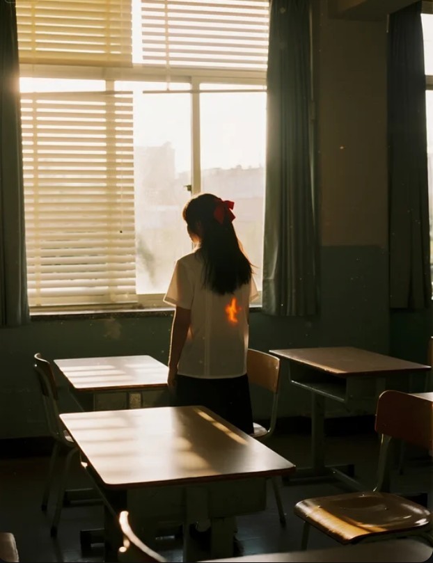 这张照片显得有些不合时宜。在数码影像统治的年代,它固执地保留着胶片的颗粒感,粗糙,陈旧,仿佛来自另一个时空。画面里,一个穿白衬衫的女孩站在教室中央,百叶窗将夕阳切割成无数道光线,在她身上留下明暗交织的痕迹。她背对镜头,始终背对镜头,只留下一个模糊却坚决的轮廓,和发间那根在逆光中格外醒目的红色发带。