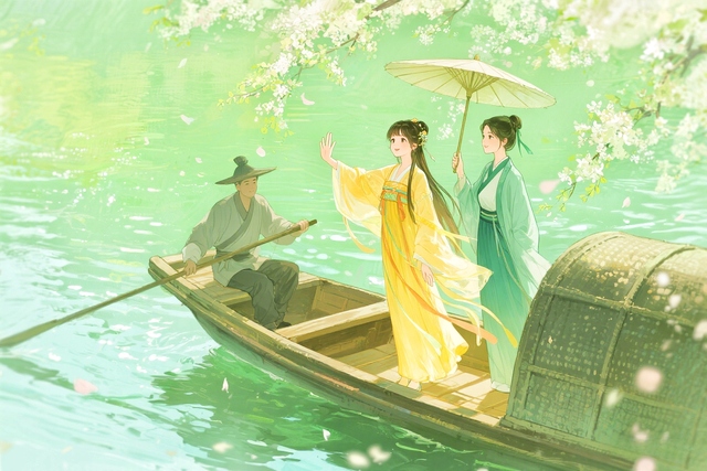 只见岸边的画舫上,一位少女站在侍女的伞下。