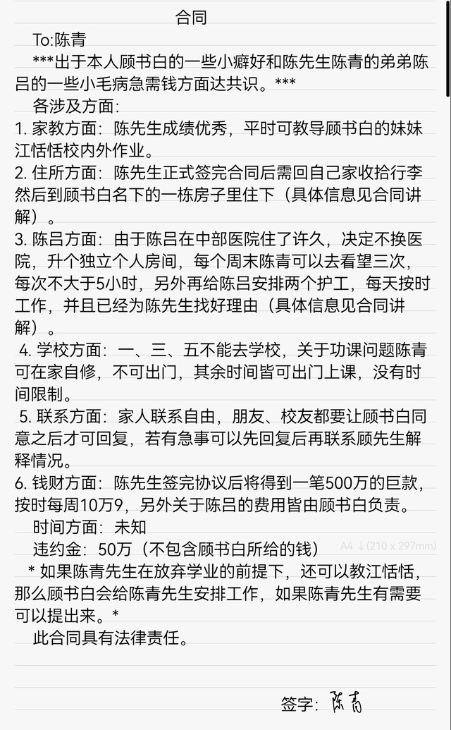 顾书白观察着他的反应,语气愈发沉稳:“最后一点,也是最重要的——你与外界的所有联系都需要经过我的批准,包括和你弟弟陈吕见面的时间与方式。”