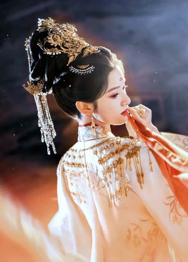 花穗子轻拂过沈云朝的脸,一张美艳不可方物的潋滟面容出现,唇红齿白,玉质天成。她身着一袭红色婚服,体态端庄,气质高贵。婚服十分精美,绣满了金色的花纹和珠片,显得华丽而富有质感。婚服的领口和袖口还有一圈白色的蕾丝,增添了一丝柔美和妩媚,头戴一顶金色的炫星凤冠,上面镶满了珍珠和宝石,彰显了她的尊贵身份。凤冠的前端还有一条金色的脸链,从额头到鼻子,再到下巴,将她的脸部轮廓勾勒出来,让她看起来更加立体和立体。她的面部还有一层红色的流苏面纱,遮住了她的大半张脸,只露出了一双明亮的眼睛。流苏随着她的动作摇曳生姿,给她增添了一种神秘和异域的气息。而面纱之下是一张倾城绝世、美艳不可方物的潋滟面容,唇红齿白,玉质天成,眉宇之间的红莲花钿与右眼角下的小小泪痣更是给其增添了些许妩媚之感,煞是美丽,凤眸潋滟,可夺魂摄魄,荡人心神,唇若点樱,引人无限遐想