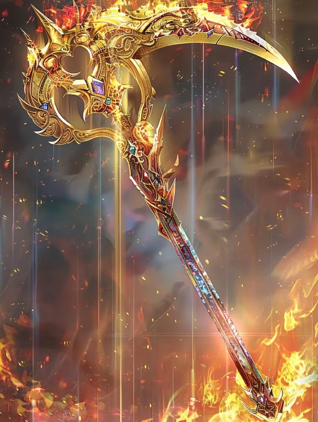 他手拿一把华丽的镰刀状兵器,通体以金色为基调,镶嵌多彩宝石,刃部与手柄处复杂精致的花纹。
