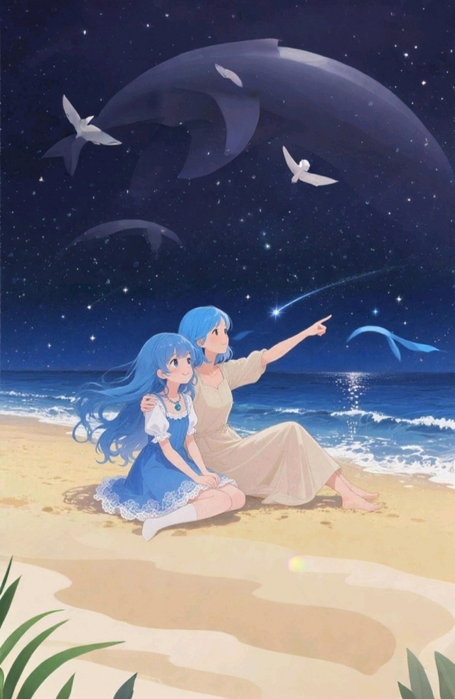 她睁开眼,先看见的是缀满碎钻似的夜空,星星密得像是谁把银河揉碎了撒下来,低低地悬在头顶,仿佛伸手就能摘到一颗。身边传来熟悉的气息,是妈妈身上总有的栀子花香皂味,她侧过头,果然看见妈妈坐在沙滩上,裙摆被晚风掀起小小的弧度,正仰头望着天。
