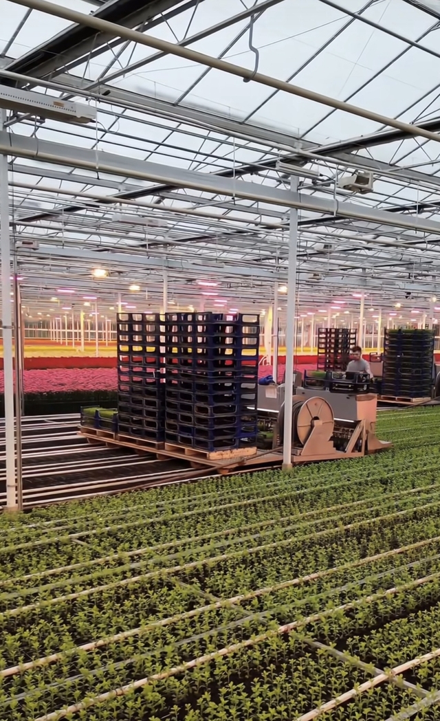 不到两个小时机器就已经完成,接下来师傅再次用叉车将花苗放在机器的板面上,师傅站在上面操作机器并放置花苗
