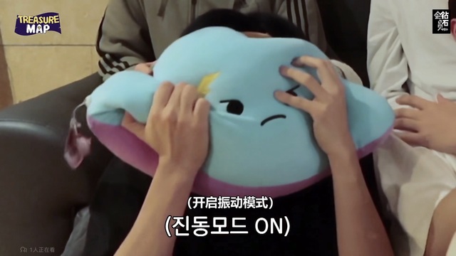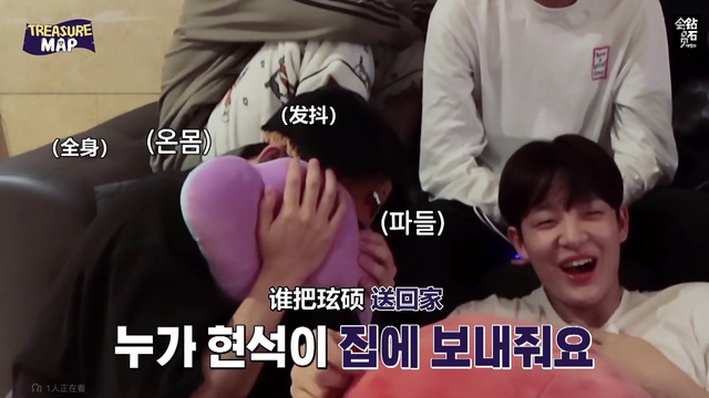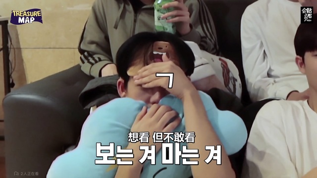 (用抱枕挡脸的崔玹硕和尖叫的朴志焄)