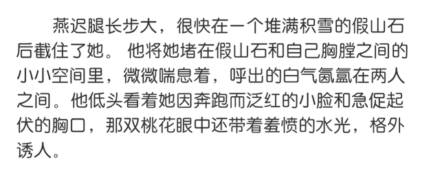 他低语,声音带着运动后的沙哑和浓烈的占有欲。不顾远处孩子们隐约的嬉闹声,他一手撑在冰冷的假山石上,一手抬起她的下巴,在纷飞的细小雪花和红梅幽香的见证下,低头便吻住了她微张的、带着凉意的红唇。